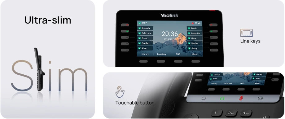 The Yealink SIP-T74W is a fashionable and smart desk phone designed for managers and professionals who value modern aesthetics, flexible connectivity, and reliable performance. Featuring a sleek slim body, 4.3-inch color screen, touchable buttons, and an adjustable stand with two angles, the T74W delivers a comfortable, business-like appearance ideal for contemporary workspaces.